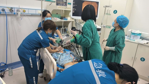 明确病因及梗阻部位后,急诊医学科医生和护士立即将患者转运回抢救室,同时请内镜室、麻醉科会诊。在多学科协作下,于22时49分成功将梗阻异物清除,患者气道恢复通畅,生命体征平稳,外周氧饱和度逐渐恢复正常,后送入消化内分泌科住院开展进一步治疗。(陈钰灵)