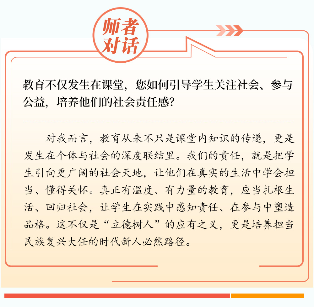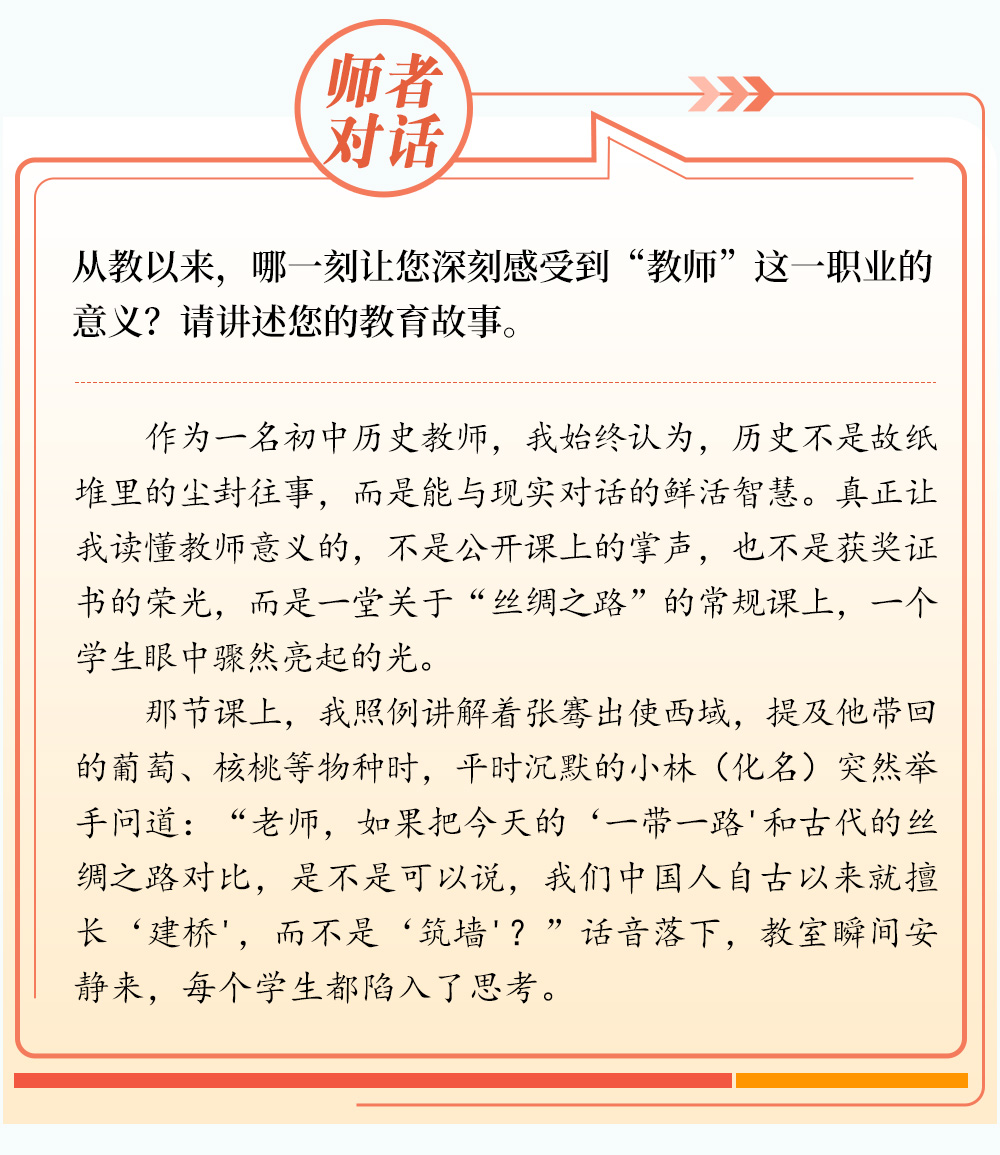那一刻让我明白,教师的意义就在于践行“乐教爱生、甘于奉献”的教育家精神。当我们用真心触动真心,用智慧启迪智慧,历史的星河就会在孩子们眼中闪耀。而我们,就在这平凡的三尺讲台上,成为了那束引路的光。