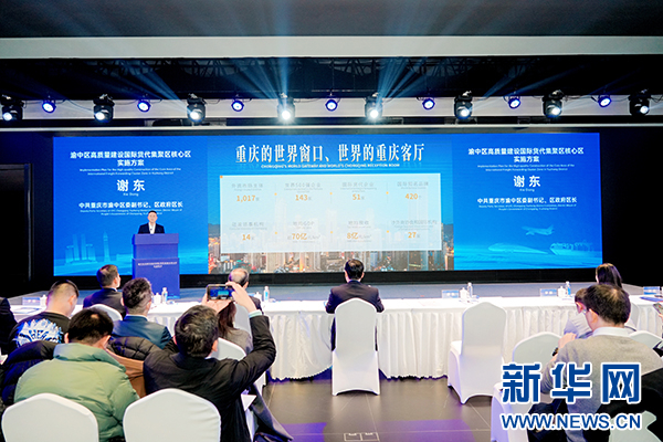 渝中区委副书记、区政府区长谢东发布《渝中区高质量建设国际货代集聚区核心区实施方案》。新华网发(渝中区商务委供图)