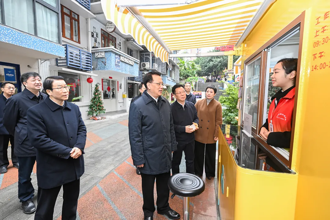 江北区观音桥街道渝北社区是全国首批完整社区建设试点,正大力推进高品质生活服务圈建设。袁家军走进社区,实地考察北仓青年夜校、北仓图书馆、社区创业街区,详细了解便民服务亭等公共设施运行情况,与沿街商户、周边群众交谈。袁家军对当地盘活闲置资源,为居民群众提供高品质公共服务的好经验好做法给予肯定。他指出,社区是基层治理的“神经末梢”,要立足实际,因地制宜,用心用情用力做好服务群众各项工作,让群众可感可及、看到变化。
