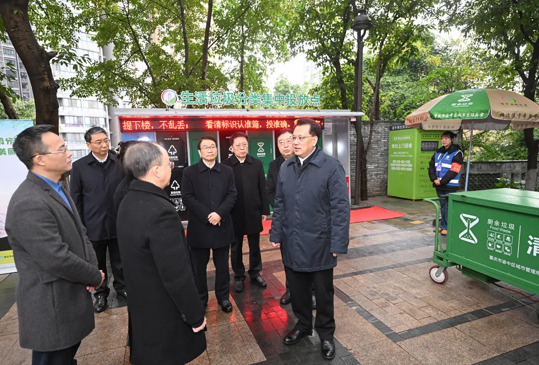 在渝中区协信公馆小区,袁家军现场调研垃圾分类工作,听取有关情况汇报,详细了解生活垃圾分类全链条管理举措,实地察看垃圾投放点、分类投放桶和收运车辆等设施配套情况,同社区垃圾分类指导员交谈。得知社区居民垃圾分类意识逐步增强,袁家军十分高兴,希望大家进一步发挥好网格员和志愿者作用,持之以恒做好这件事,推动生活垃圾分类水平实现新提升,推动社区卫生文明建设实现新进步。袁家军指出,要抓好垃圾处理基础设施建设,加快补齐短板弱项,全面提升处理能力,着重做好生活垃圾干湿分类,探索以社会化、市场化、专业化方式增强二次分拣能力,提高生活垃圾回收利用和有毒有害垃圾处理水平,确保今年底实现全市原生生活垃圾“零填埋”目标。要加大垃圾分类宣传引导,鼓励广大城乡居民积极参与、主动作为,让垃圾分类成为低碳生活新时尚。