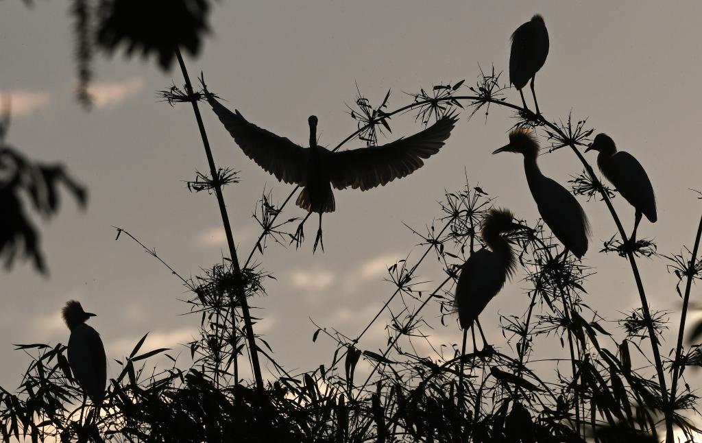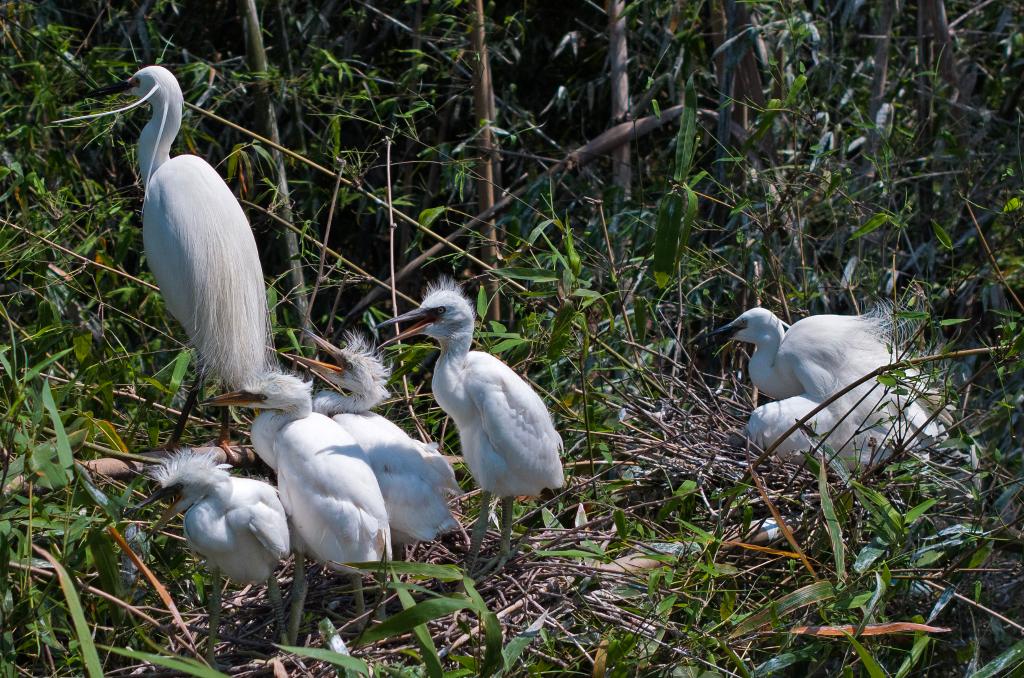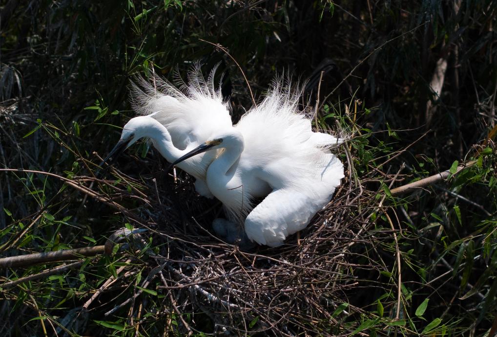 4月20日,在重庆市大足区珠溪镇,两只成年白鹭在抚养刚出生不久的幼崽。新华社记者 陈诚 摄