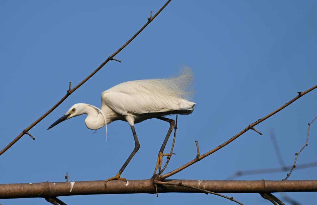 4月21日,在重庆市大足区珠溪镇,一只白鹭小心翼翼地走在竹枝上。新华社记者 陈诚 摄