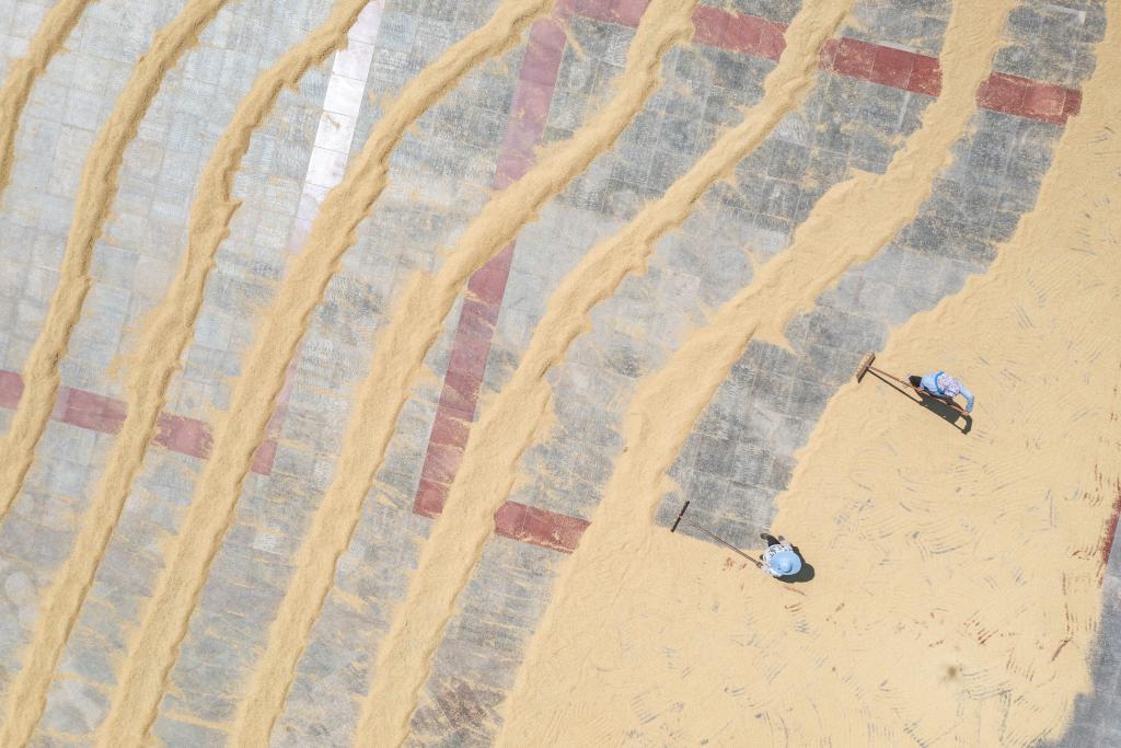 8月20日,人们在重庆市永川区红炉镇政府广场上晾晒粮食。