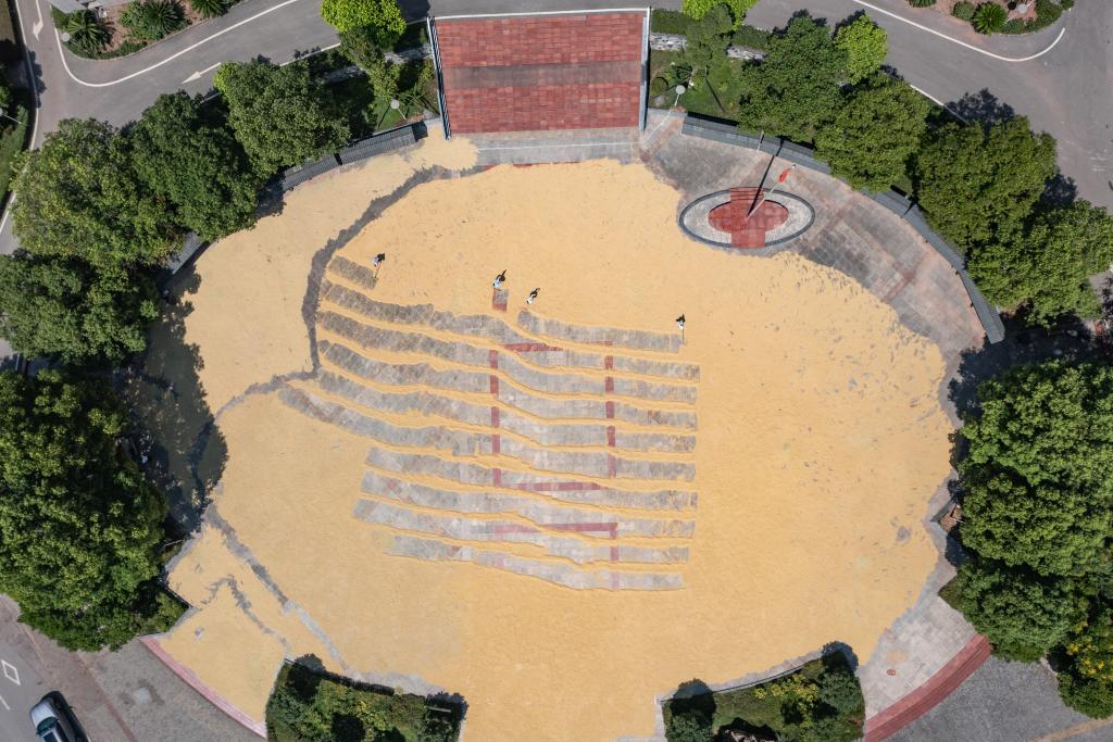 8月20日,人们在重庆市永川区红炉镇政府广场上晾晒粮食(无人机照片)。