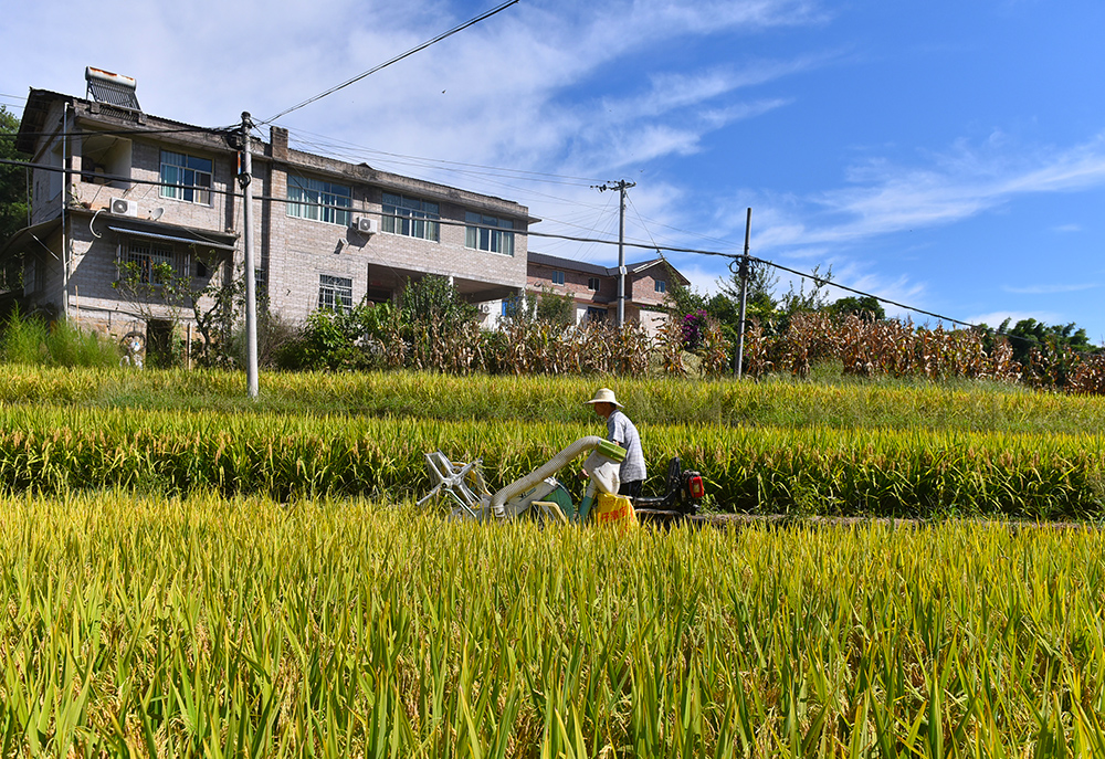 8月25日,重庆市涪陵区青羊镇兴园村,当地村民正使用微型收割机收割稻谷。新华网发(黄河 摄)