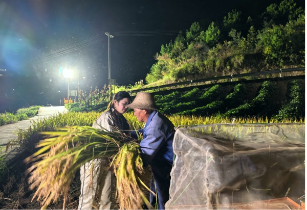 在照明设备的支持下,收割机得以夜间持续作业,大幅延长了抢收时间。农机重新开足马力,在田里往来穿梭。电网员工们也全力以赴,有的帮忙搬运装袋,有的下田共同收割,与农户们并肩作战。