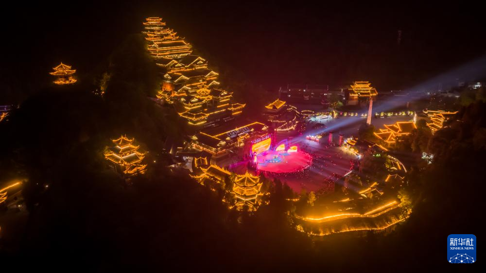 夜幕降临,现代光影与古建筑相映成趣,非遗展演、苗族歌舞、美食夜市让重庆市彭水苗族土家族自治县蚩尤九黎城景区吸引了大量游客。来自湖北的游客李娜说,夜游蚩尤九黎城景区跟白天来游览是完全不一样的体验,光影秀很震撼,苗族歌舞、传统技艺有特色,不虚此行。