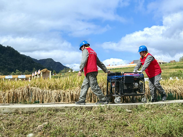 国网重庆城口供电公司员工对丰收节活动现场线路进行巡视检查。