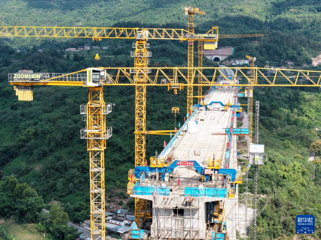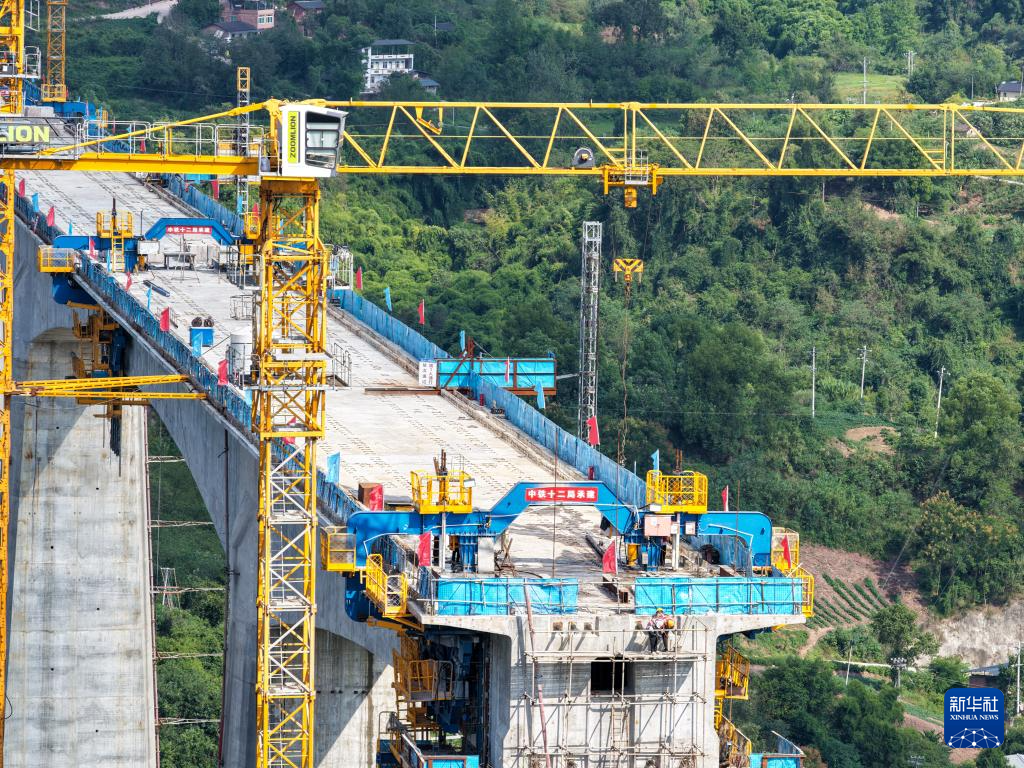 这是9月24日拍摄的渝万高铁五步河双线特大桥建设现场(无人机照片)。新华社记者 唐奕 摄