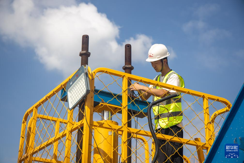 9月24日,工人在渝万高铁五步河双线特大桥建设现场施工作业。新华社记者 唐奕 摄