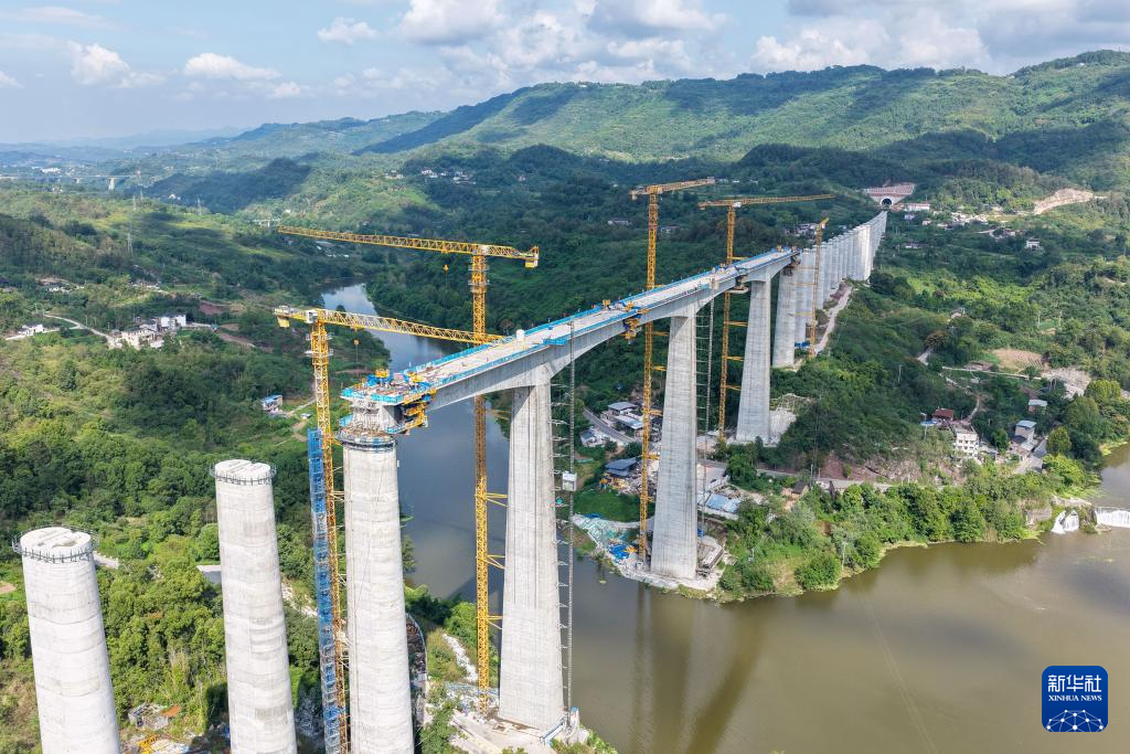 这是9月24日拍摄的渝万高铁五步河双线特大桥建设现场(无人机照片)。