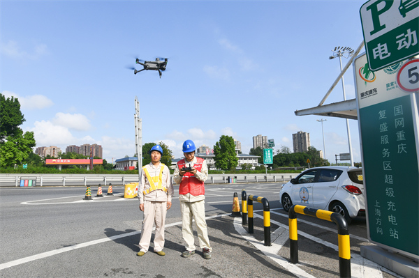 9月24日,运维人员使用无人机对复盛高速公路服务区充电站涉及的相关线路进行外破巡视。(冯胜岚 摄)
