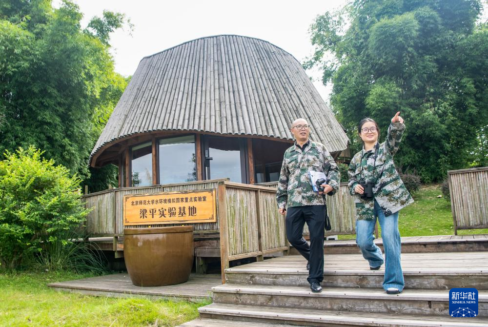 9月26日,重庆市梁平区湿地保护中心工作人员余先怀(左)、吕妮洪在双桂湖国家湿地公园内巡护。新华社记者 唐奕 摄