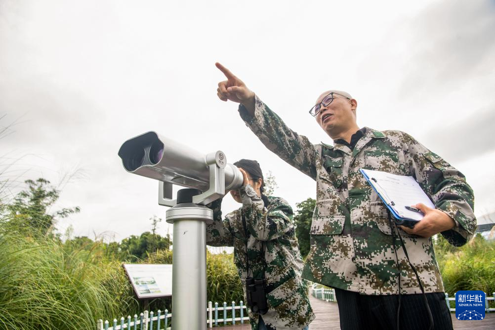 9月26日,重庆市梁平区湿地保护中心工作人员余先怀(右)、吕妮洪在双桂湖国家湿地公园内使用望远镜观测鸟群。新华社记者 唐奕 摄