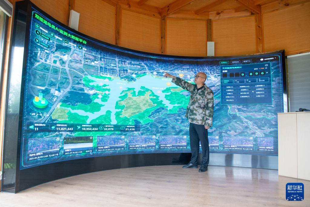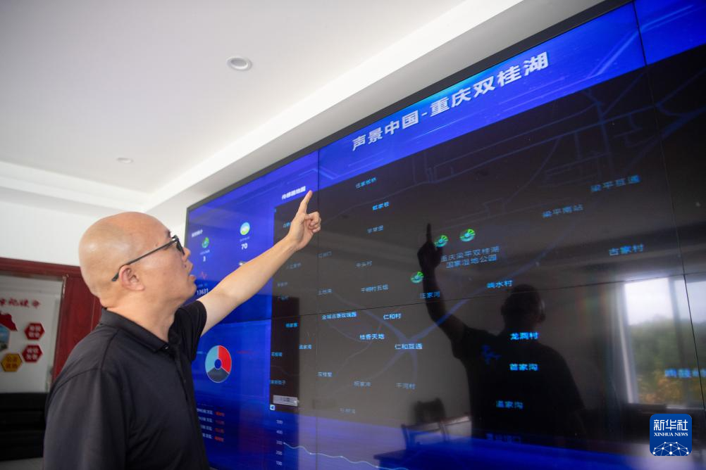 9月26日,重庆市梁平区湿地保护中心工作人员余先怀在双桂湖国家湿地公园内介绍鸟类AI监测大数据平台。新华社记者 唐奕 摄
