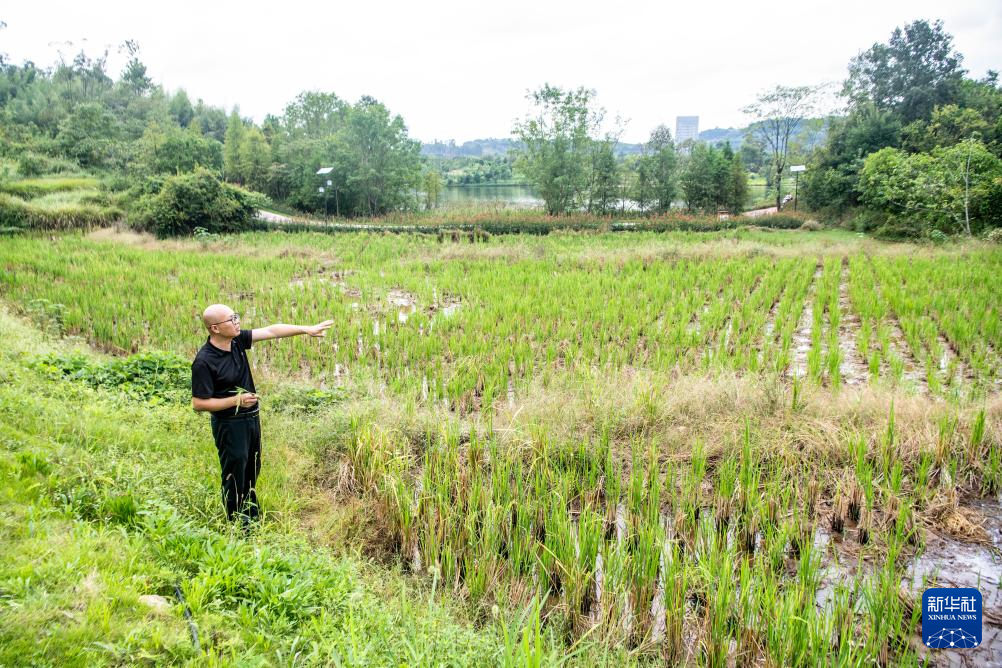 9月26日,重庆市梁平区湿地保护中心工作人员余先怀在双桂湖国家湿地公园内查看稻田情况。公园内耕种了450亩环湖水稻田,这是冬候鸟的食物来源之一。新华社记者 唐奕 摄