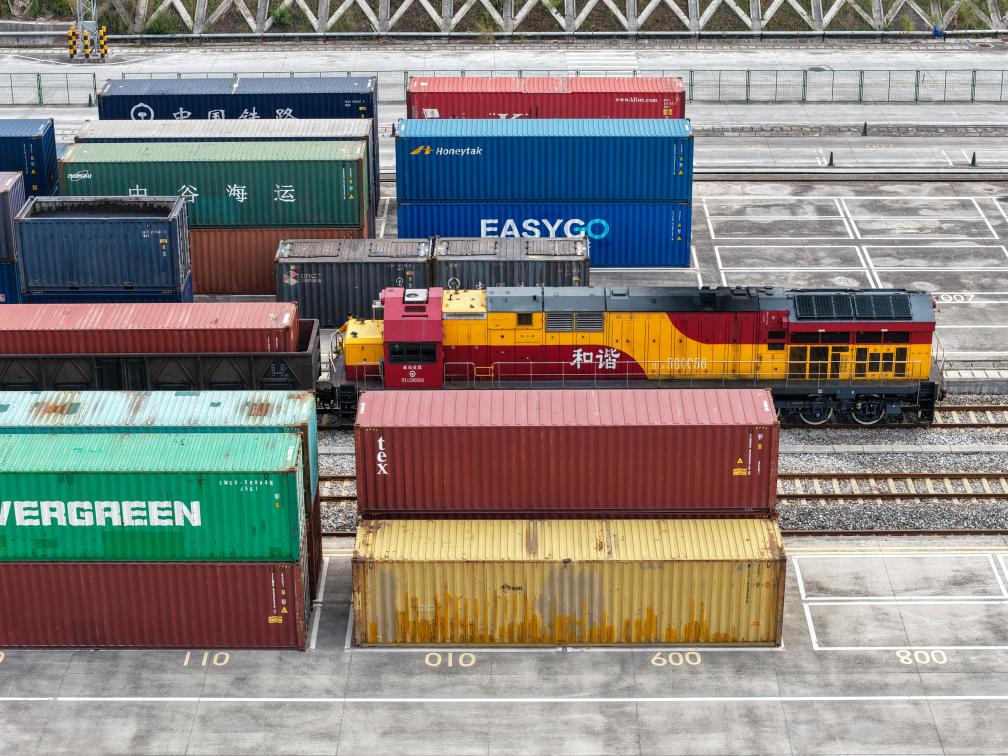 9月28日,西部陆海新通道班列在重庆鱼嘴站等待发车(无人机照片)。新华社记者 唐奕 摄