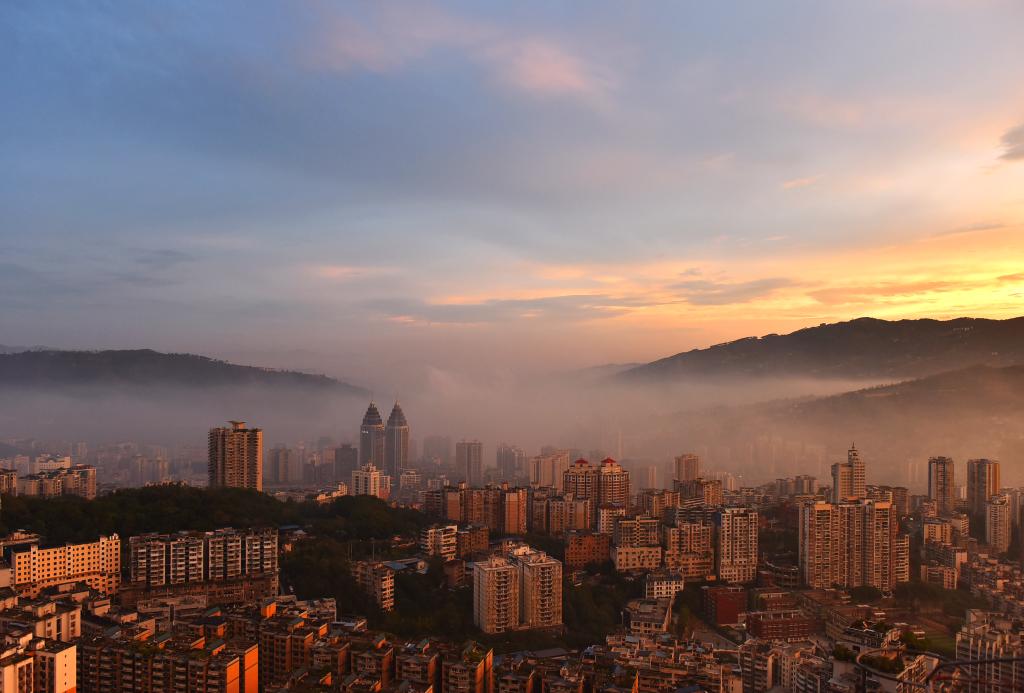 朝霞满天,位于长江边的涪陵城区如梦似幻。城市在这漫天朝霞中渐渐苏醒,开启活力满满的一天。新华网发(黄河 摄)