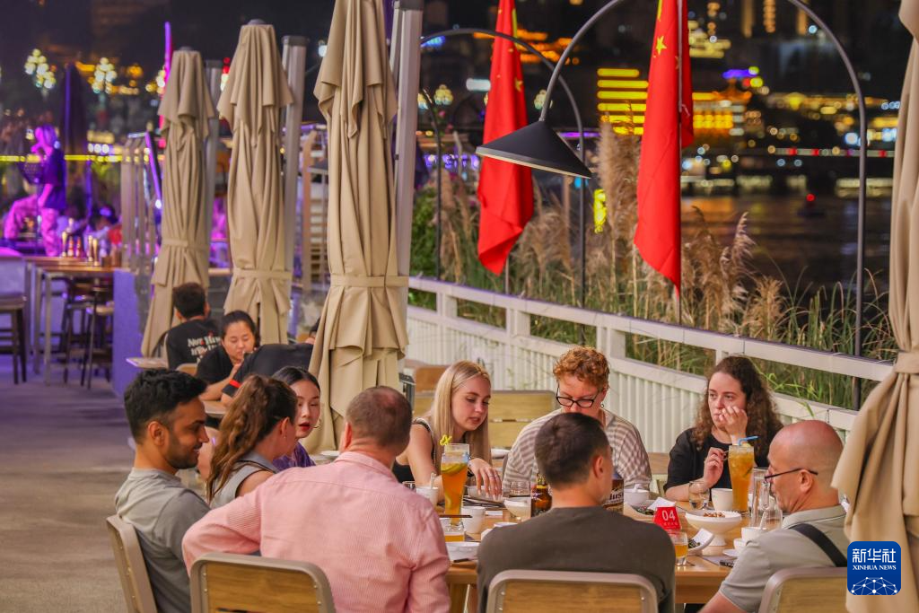 9月30日,外国游客在重庆市南岸区南滨路品尝重庆美食、欣赏夜景。新华社记者 黄伟 摄