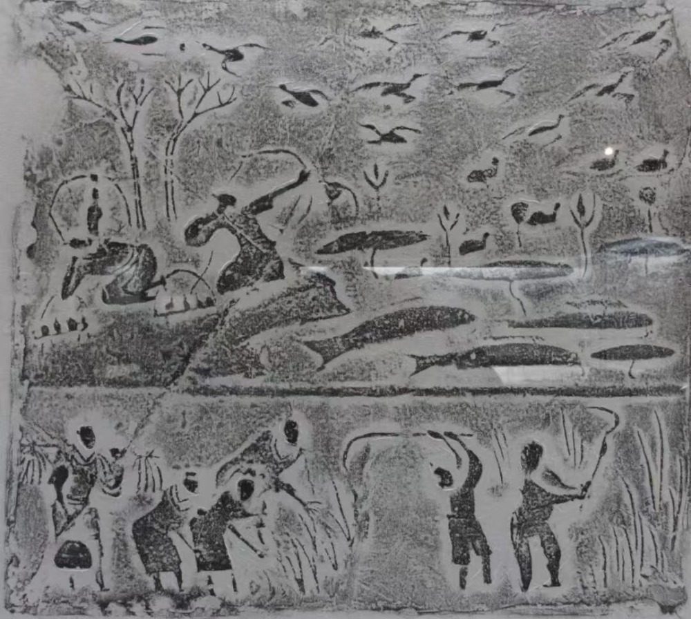 另一块“弋射收获画像砖”则描绘了更加丰富的生活场景。画像砖上半部,猎人张弓射雁,莲池中鱼鸭嬉游;下半部,农人挥镰割稻,挑担送饭者穿梭田间。
