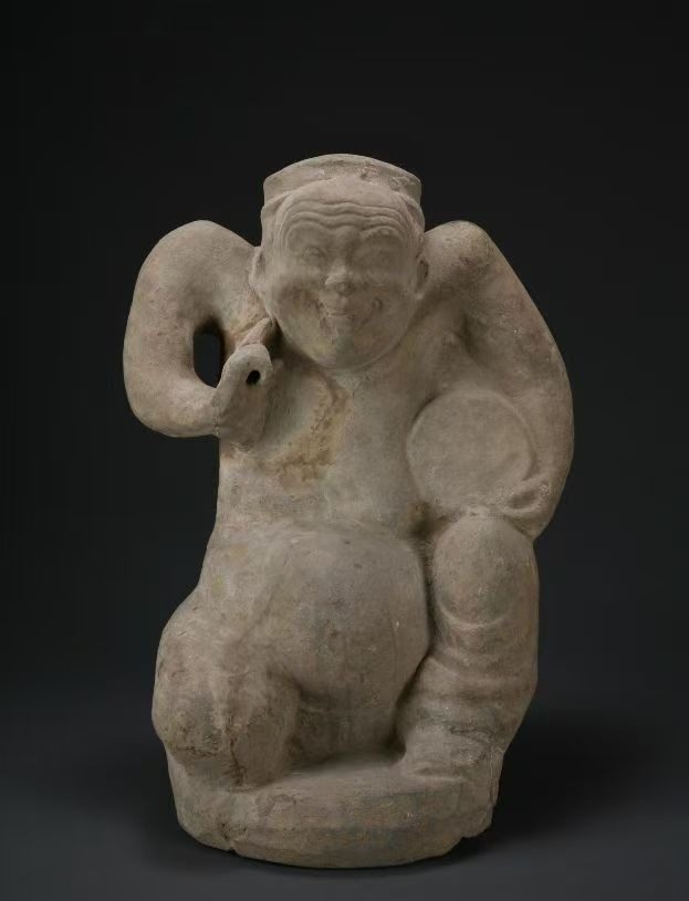 陶俑张嘴嬉笑,眯缝双眼,表情俏皮,仿佛正表演到精彩处。