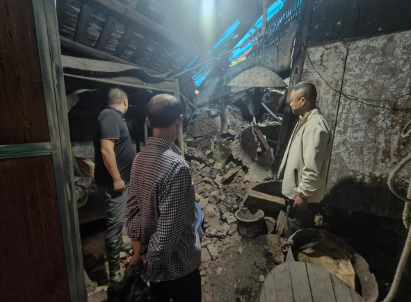 29日清晨6时20分左右,伴随一阵巨响,杨柳村7社黄朝祥家屋后发生边坡垮塌,塌方量约30立方米,致其家中房屋后墙受损。由于提前转移,该处险情未造成人员伤亡。