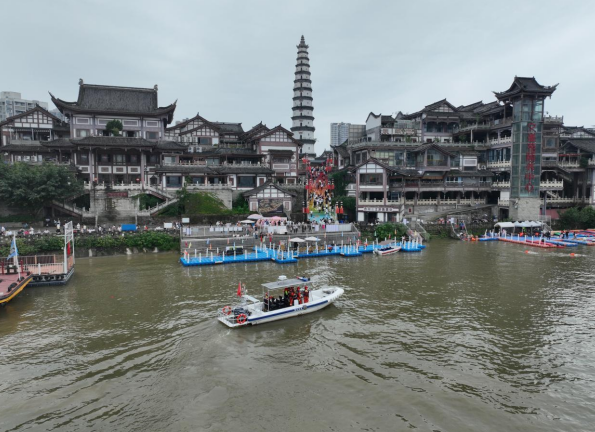 重庆市专业应急救援合川支队在文峰古街开展水上巡护。