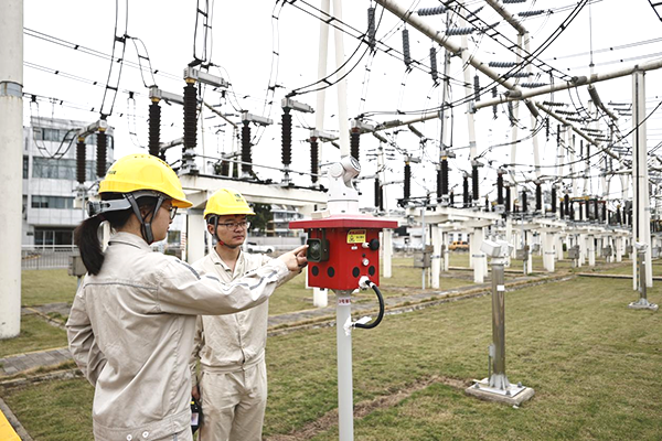 10月9日,在220千伏走马羊变电站内,国网重庆市南供电公司工作人员正在对新上岗的智能综合激光驱鸟器进行巡视检查,确保驱鸟器运行正常。