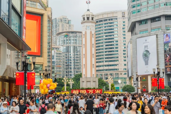同时,渝中还通过开展多元促销,打造引力强劲的“消费新磁场”。高端消费方面,9月25日至国庆中秋假期,24家国际知名品牌开启国际名品大促,参与品牌销售同比增长13.4%、环比增长73.7%。节日期间,欧米茄、蔻蕊、浪琴、哥伦布、杰尼亚销售分别增长1.5倍、1.4倍、51%、41%、31%。大众消费方面,龙湖重庆时代天街、国泰广场等推出大额满减,重百、大都会等推出“假日碰头会”“即兴跳动·漫舞聚场”等主题活动。