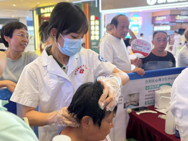 合川区精神卫生中心心身科医生为市民按摩耳穴。