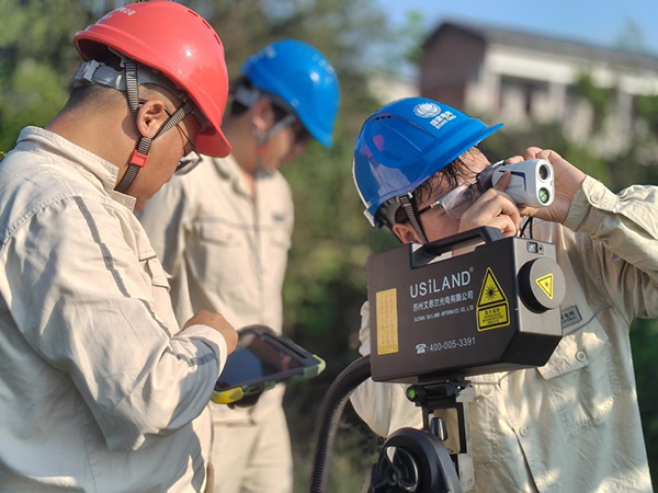 国网重庆璧山供电公司员工在10千伏蒲浸线浸镇支线附近架设激光仪。