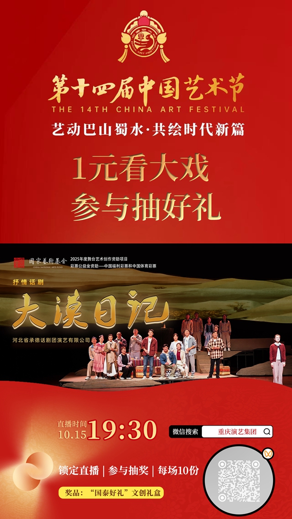 除今晚的精彩演出之外,第十四届中国艺术节期间,还将有小戏曲类组台演出、舞剧《醒·狮》,歌剧《柳柳州》《侨批》,话剧《北上》《俗世奇人》《谁在敲门》《于成龙》《沧浪之水》等参与直播抽奖,观众可通过重庆演艺集团腾讯视频号参与“1元看大戏,参与抽好礼”活动。