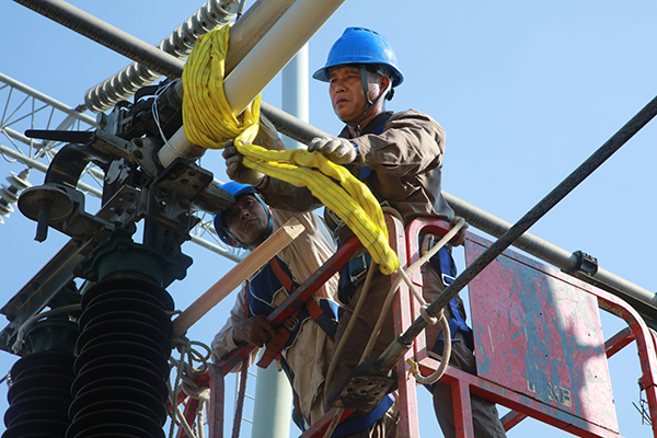 国网重庆璧山供电公司员工在220千伏凤凰变电站更换高压刀闸。(蒋佩 摄)