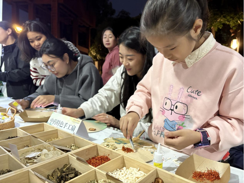 在中医特色手工扇制作台前,孩子们在家长的帮助下,将百合、丁香、红花、木蝴蝶、合欢皮等中药材细心粘贴在扇骨上。“这把扇子不仅美观实用,制作过程中还能帮助孩子认识中草药。”一位正在指导孩子制作的父亲说道。