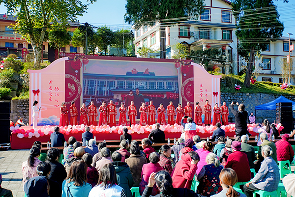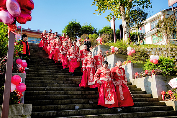 10月28日,南川区兴隆镇永福村孝道文化广场洋溢着温馨喜庆的氛围,由南川区新时代文明实践中心主办的“文明实践178·孝道春风暖重阳”集体婚礼暨文明家风传承活动在此温情举行。80余位老人与志愿者们欢聚一堂,共同见证九对恩爱夫妇的集体婚礼,在重阳佳节传递孝老爱亲、婚事新办的文明新风。