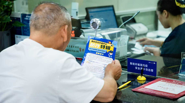 老年客户在柜台学习反诈知识。
