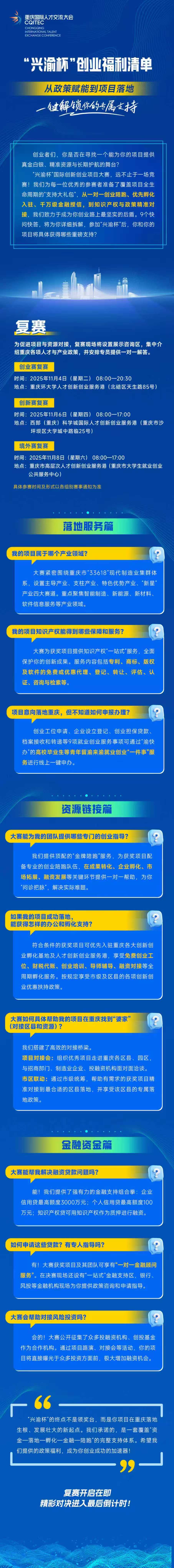 为最大限度促进项目与产业、资源、政策的深度融合,复赛现场将特设展示区,集中展示重庆市的人才引进计划、各类产业政策、创新创业扶持政策及金融支持措施,并安排专职工作人员提供“一对一”现场咨询,为参赛选手和各类人才答疑解惑,搭建高效沟通的桥梁。同时,赛事方梳理了创业者最关心的9大问题,帮助参赛者们提前了解可获得的各项重磅支持。