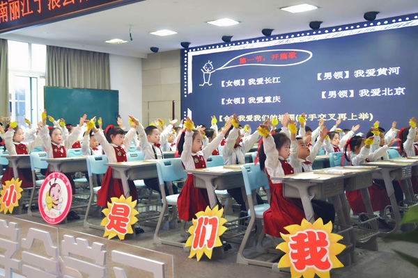活动伊始,鲤鱼池小学团队带领来访同仁开启校园参观之旅,重点展示了学校特色的“有氧教育课程”。该课程深度融合“五育并举”理念,通过丰富的活动设计与场景营造,让教育充满活力与温度;随后,一年级、四年级学生分别结合班级文化与年龄特点,带来“有氧明理童谣展示”,稚嫩的声音与生动的演绎,展现出鲤鱼池小学在德育渗透与习惯培养上的扎实成果。