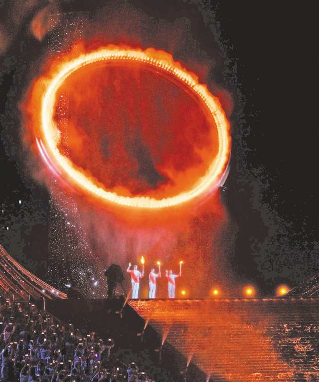三人手持火炬,踏浪而上,共同点燃了本届全运会主火炬——引天之光,燃海之火。