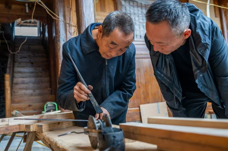 过去,年轻人觉得老手艺没前途纷纷外出打工。如今,河湾山寨焕发的新生机正悄然改变他们的想法。在“两河书院”和博物馆里,越来越多“90后”“00后”甚至“10后”的身影出现,他们围着老匠人专注学习辨识木料、练习凿刻榫卯,系统研习营造原理。单一欣喜地发现,年轻人眼中闪烁着热情,像12岁土家族少年邹君洁这样的年轻一代,通过制作迷你吊脚楼模型展现了对传统技艺的热爱,正为非遗传承注入青春力量。