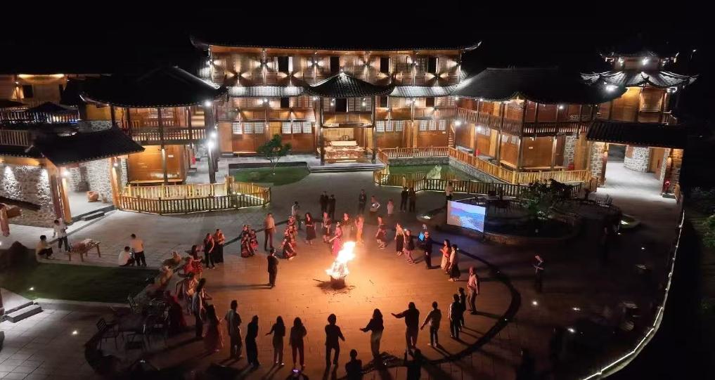 2023年,这座三层吊脚楼民宿终于落成。在其侧配套建设的悬空式吊脚楼作为餐厅及会议室,飞檐翘角,悬柱下端精雕着鱼、瓜等装饰。