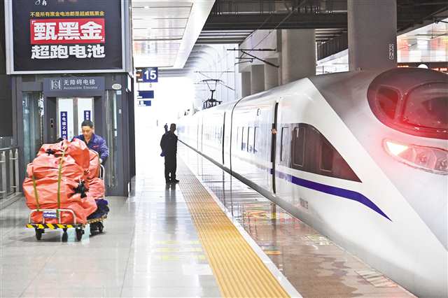 11月10日,中铁快运的工作人员将高铁列车上的快递运往营业部。重庆火车站为“双十一”货物开设快递包裹绿色通道,以保障运输效率。特约摄影 孙凯芳/视觉重庆