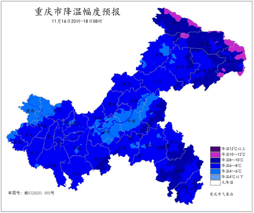 新华网重庆11月14日电(李海岚)重庆市气象台消息,近期重庆将迎来下半年首场强降温天气。预计16日夜间至17日夜间,北方强冷空气将自北向南影响重庆市,大部地区日平均气温下降5—8℃,局地可达10℃;17日夜间,大部地区最低气温将降至6—8℃,城口、巫溪、开州、巫山海拔1200米以上地区降至1℃以下。