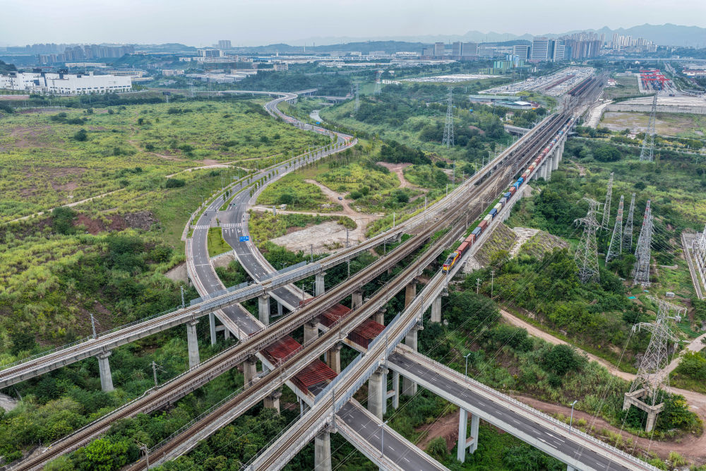 9月28日,西部陆海新通道班列在重庆鱼嘴站顺利发车。(唐奕 摄)