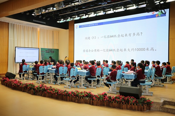 其中,小学数学跨学科主题学习课堂建设交流活动同步开展。珊瑚实验小学、珊瑚鲁能小学教师带来精彩的主题短讲与课例展示:教师余燕燕《智慧城市小管家——用编程思维构建分段计费模型》阐释数学与编程的融合路径;教师杨春梅《分段计费遇见代码》以出租车计费为场景,通过编程实践锻炼学生协作与问题解决能力;教师周颖《“亿探究竟”——一场关于巨数的跨界探索》让抽象大数变得可感可探;教师柳倩《纸上谈“亿”》融合多学科素养,破解大数教学难题。