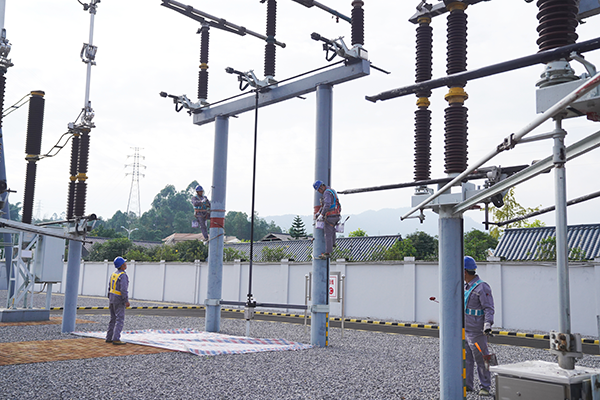 工作人员在220千伏金龙变电站220千伏开关场对设备构架、支柱等开展防腐刷漆工作。(颜玲莉 摄)