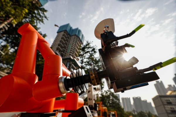 此次作业是为满足弹子石片区及周边区域用电负荷增长需求,保障长嘉汇周边充电站供电可靠性而开展的业扩接火关键环节。传统10千伏线路搭头作业需2名作业人员穿戴绝缘装备,在高空直接接触带电体协同操作,不仅劳动强度大、安全风险高,还易受天气环境影响。此次投用的双臂带电作业机器人整合了仿真建模、视觉识别与运动控制三大核心技术,搭载高清视觉系统和多维度传感设备,可自主完成环境扫描、路径规划,机械臂运动轨迹误差控制在0.5毫米以内,展现出“外科手术”般的精细操作能力。