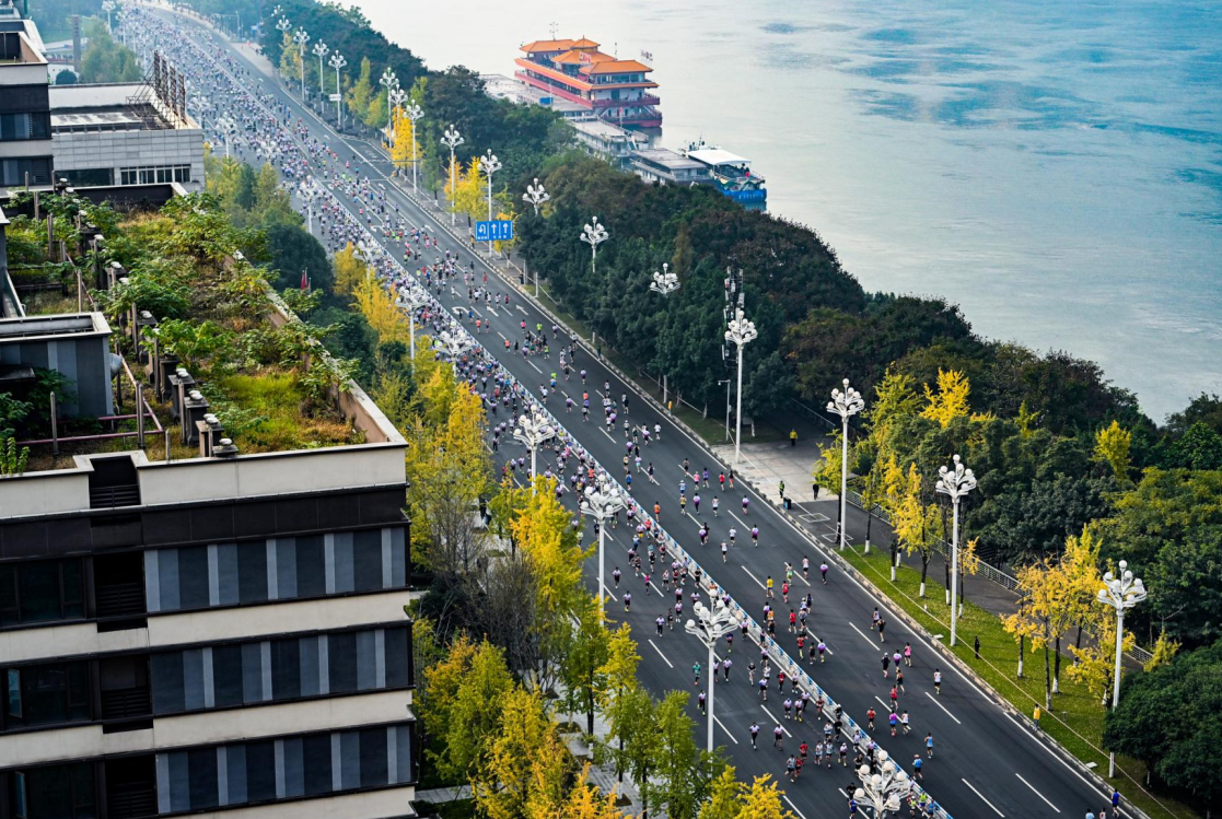 上午9点,比赛准时发令,选手们迎着山城晨曦,沿长江之滨开启奔跑之旅。