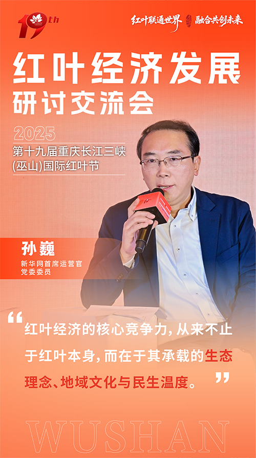 新华网重庆11月30日电(葛琦)11月28日,在“红叶联通世界 融合共创未来”红叶经济发展研讨交流会上,新华网首席运营官、党委委员孙巍畅谈主流媒体如何利用自身全媒体矩阵与创意策划能力,将独特的“红叶故事”讲出新意、讲出影响力,实现从景观传播到品牌价值的升华。